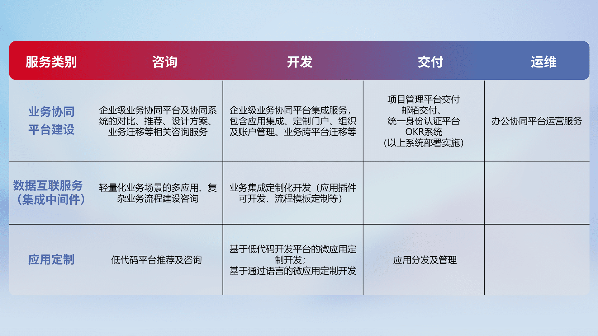 针对钉钉、、企微、、、、IDaas等平台级产品提供产品的规划、、、、方案、、交付、、定制化开发等服务,,,,实现如统一协同办公、、、智能客户服务、、、混合会议管理、、智能数据查询、、、、等业务场景,,实现数字化转型。。。。